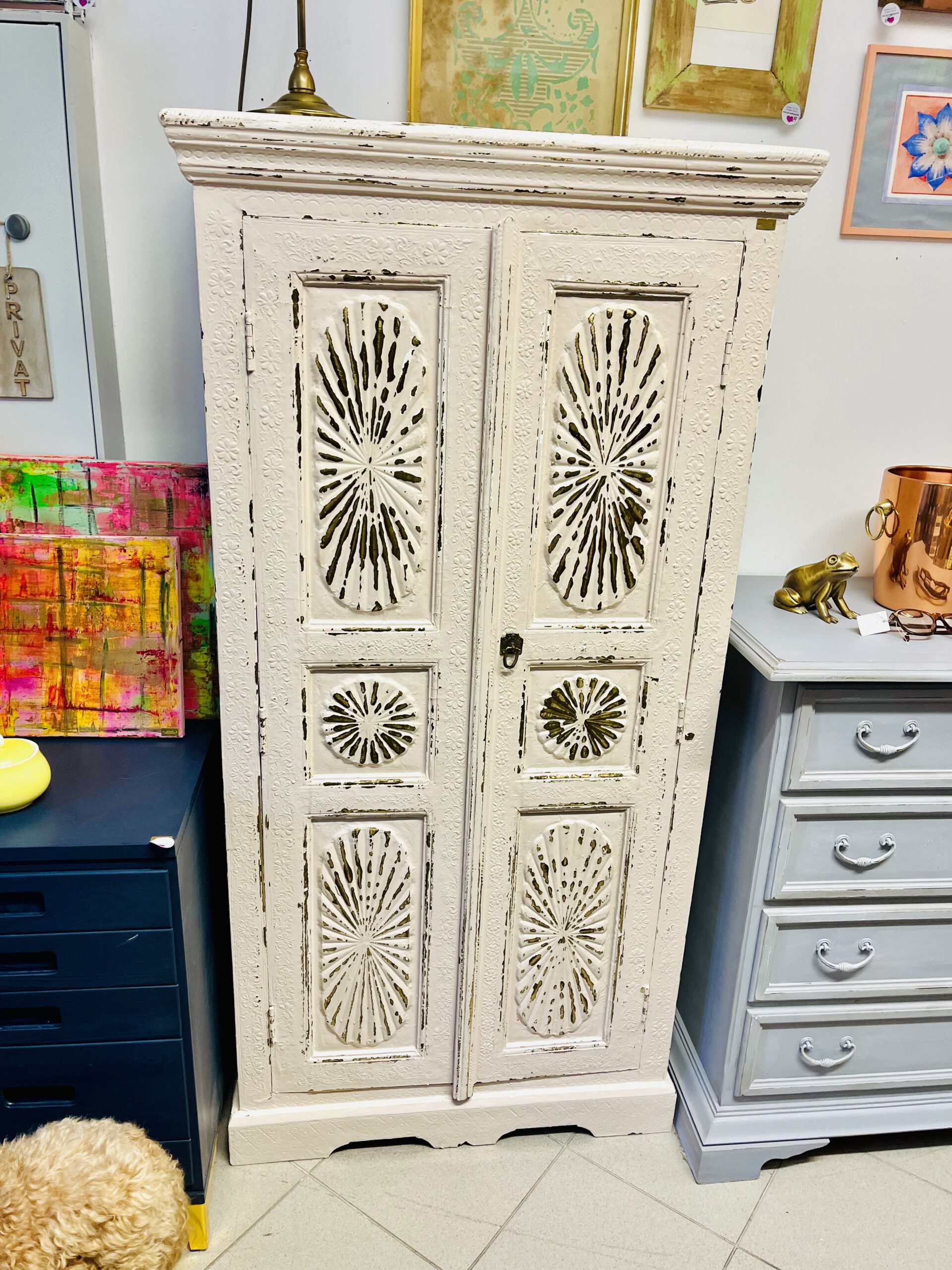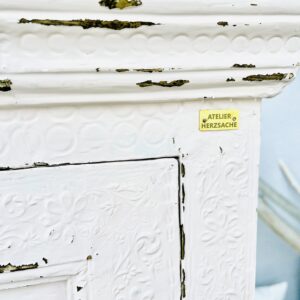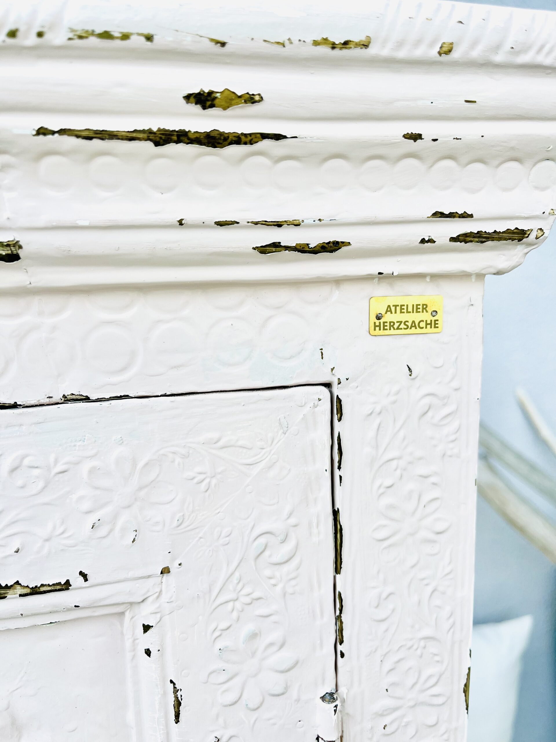 Der Schrank wurde in einem ganz hellen rosa lackiert und anschließend abgeschliffen-sodass der gemusterte Messinguntergrund zum Vorschein kommt.